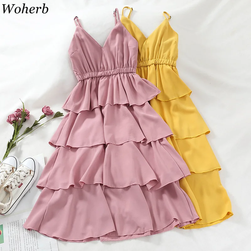 Woherb летнее Элегантное Вечернее Платье женское 2019 Новое модное платье с v-образным вырезом и рюшами на бретельках женское платье без рукавов ...
