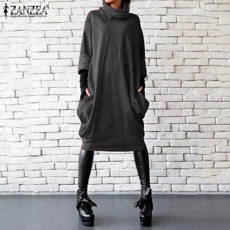 2019 размера плюс ZANZEA осеннее платье женское повседневное винтажное однотонное платье с высоким воротом и длинным рукавом Сарафан Vestidos женское асимметричное платье