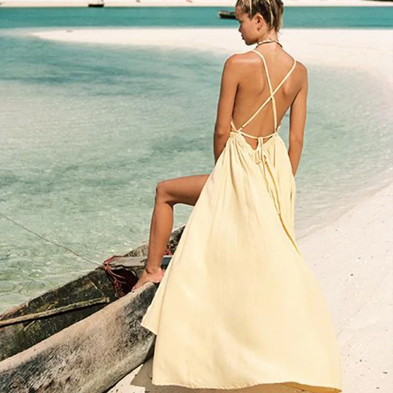 Лето приморский пляж рукавов Слинг платье с открытой спиной Глубокий V образным вырезом Высокая талия Longuette праздничные платья Vestidos Verano Rz *