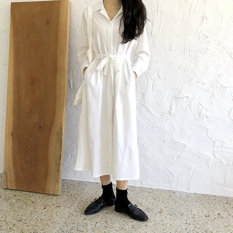 Осеннее белое платье, женское однотонное платье-рубашка с длинным рукавом, офисное женское платье с поясом, черное Мягкое хлопковое повседн...