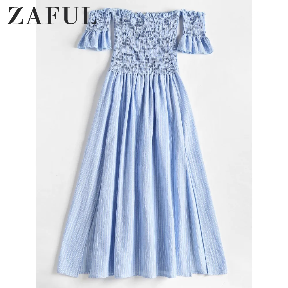 ZAFUL Полосатое платье миди с открытыми плечами женское пляжное Хлопковое платье с короткими рукавами Vestidos 2018 летнее Повседневное платье жен...