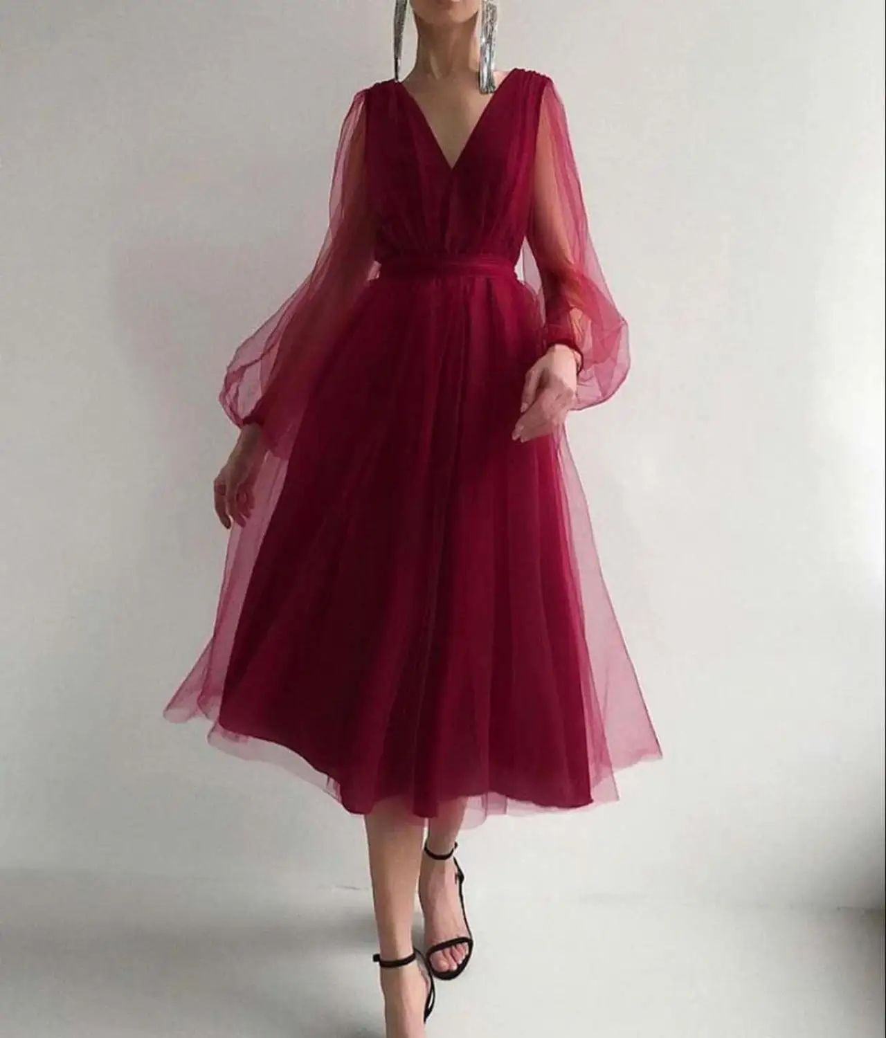 Женское Сетчатое платье Missord, однотонное платье средней длины с длинным рукавом-фонариком и глубоким треугольным вырезом, лето 2020