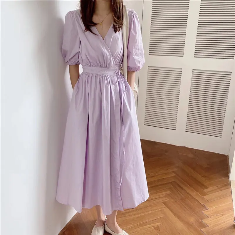 HziriP корейские винтажные сплошная шикарная элегантность пышные рукава v-образным вырезом 2020 новые сексуальные стройные милые летние универсальные трапециевидные длинные платья