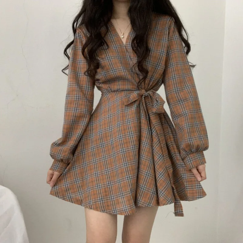 Платье с длинным рукавом, женское винтажное мини-платье с v-образным вырезом, корейское короткое платье на шнуровке с высокой талией, консер...