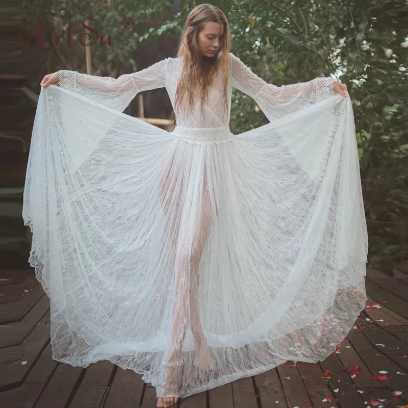 ArtSu 2020 весеннее женское элегантное цветочное кружевное платье с v-образным вырезом в пол, Сексуальные Длинные Макси Вечерние Платья, белое богемное платье