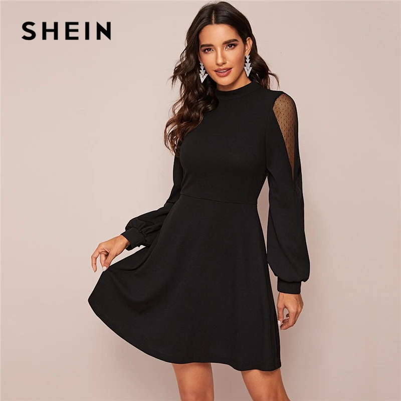 SHEIN черное однотонное платье с воротником-стойкой в швейцарский горошек с сетчатой вставкой элегантное женское весеннее платье с высокой т...