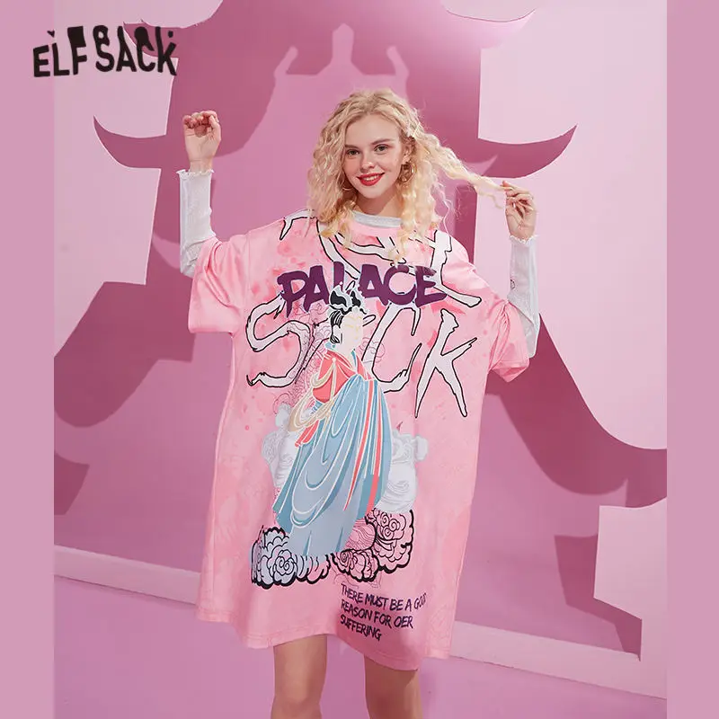 Elfsack розовый Оригинальный графический принт Повседневное в Корейском стиле мини платье Для женщин 2020 летнее бело-серые короткий рукав Винтаж женские повседневные платья