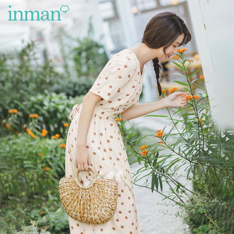INMAN Summer New Arrival Japanese Style Simple Design Back Tie Fit Round Collar Shot Sleeve Dot Pattern Long Dress