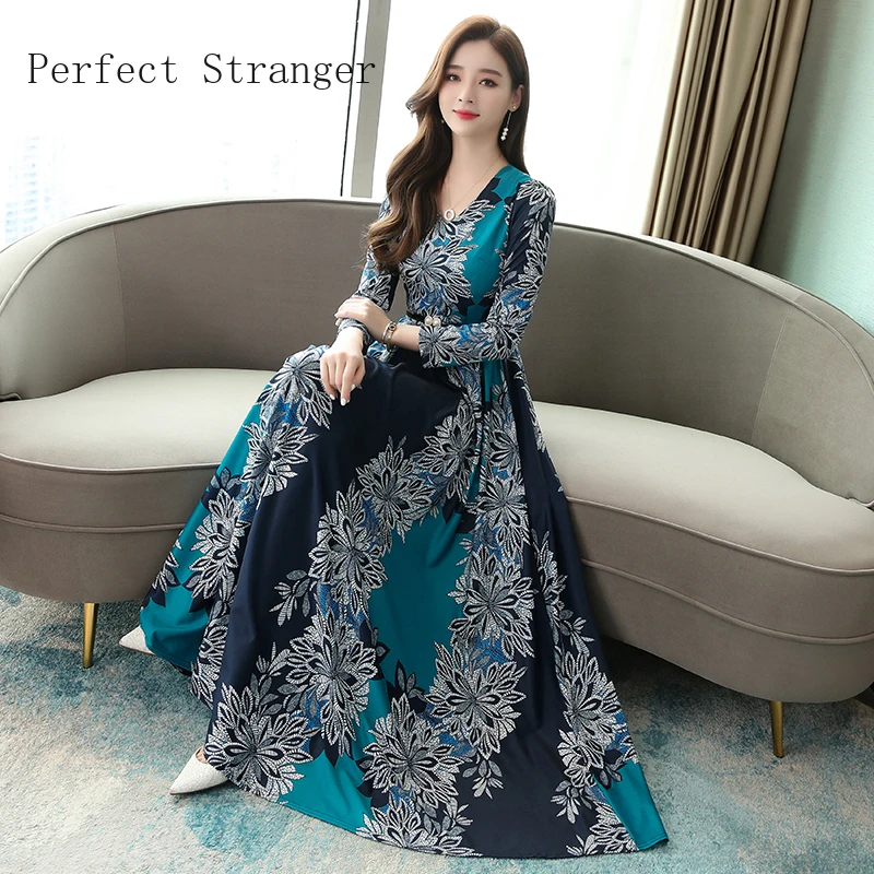 Лидер продаж; большие размеры; Новинка 2019 года; сезон осень; элегантное платье с v-образным вырезом и цветочным принтом; длинный рукав женщин...