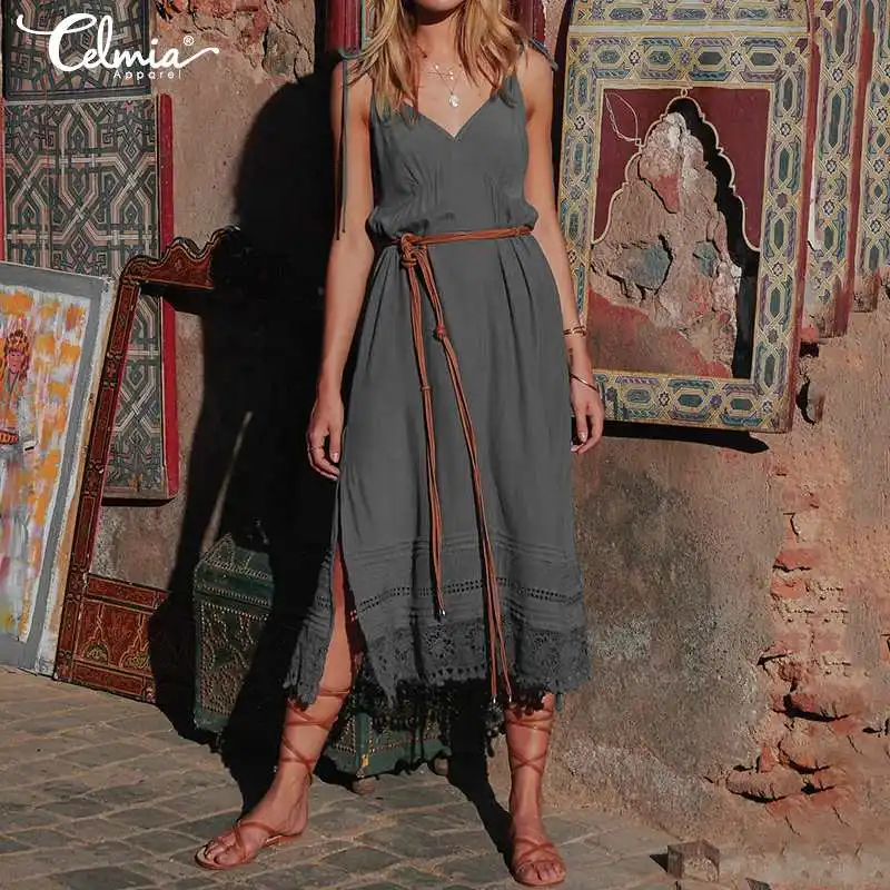 Лето 2019, женское богемное пляжное сексуальное платье с v-образным вырезом на бретельках, повседневное кружевное лоскутное платье без рукавов с разрезом размера плюс