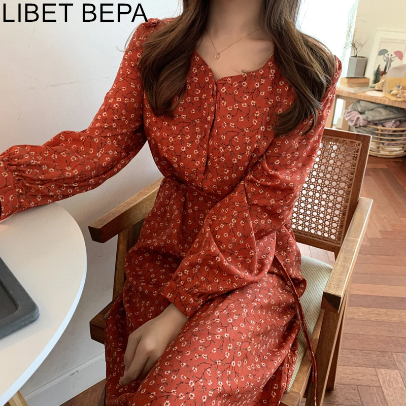 Новинка 2020, весенне-осеннее женское платье с цветочным принтом, v-образным вырезом и пуговицами, модное, на шнуровке, с бантом, для девушек, с высокой талией, повседневное, миди платье DR2031