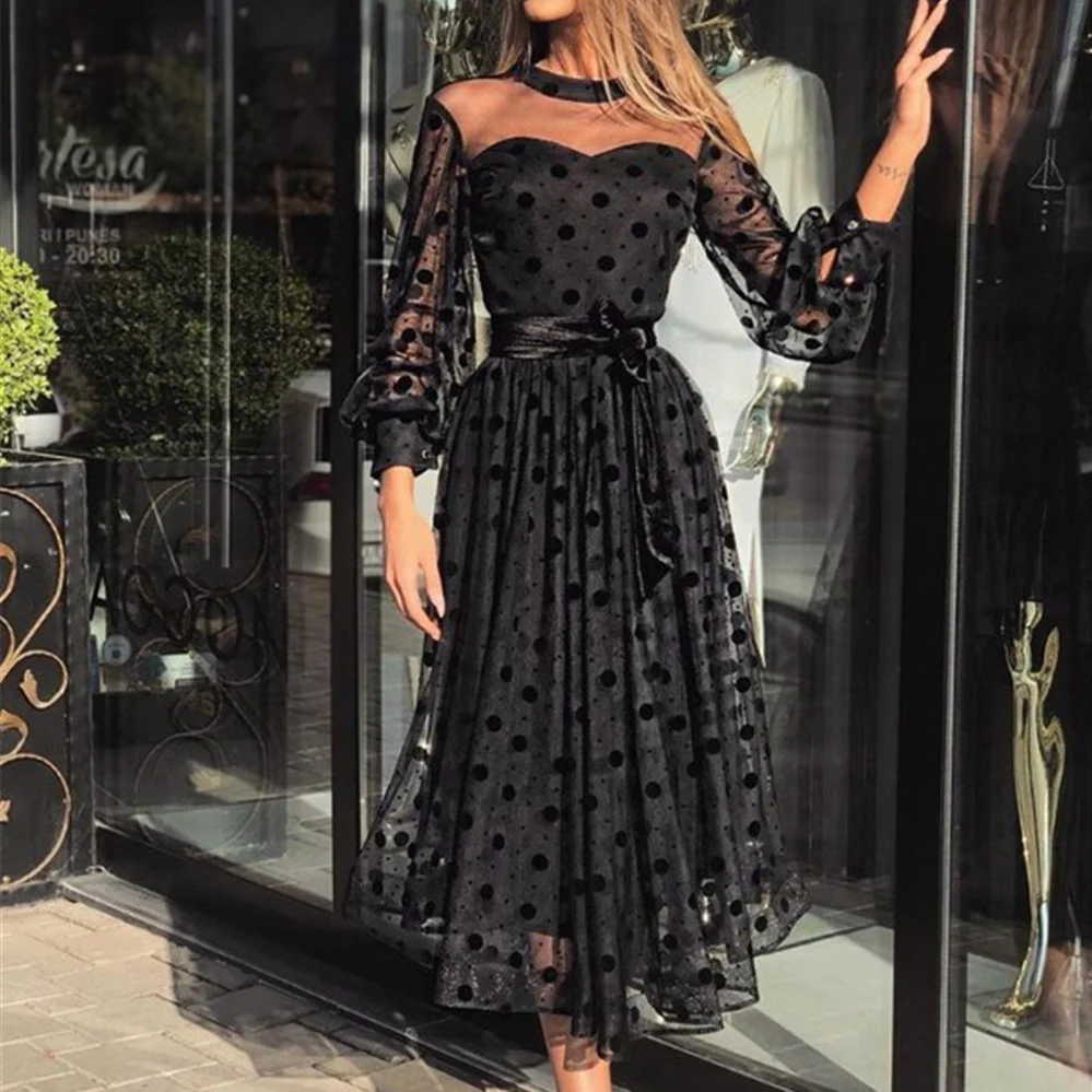 Черное платье в горошек, сексуальное вечернее платье для женщин, Дамское кружевное Сетчатое прозрачное дамское бальное платье с длинным рукавом, одежда размера плюс