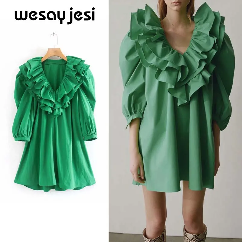 Женское платье, лето 2020, винтажный стиль, каскадные пышные рукава, зеленый цвет, поплин za платья, vestidos de playa mujer, вечернее платье