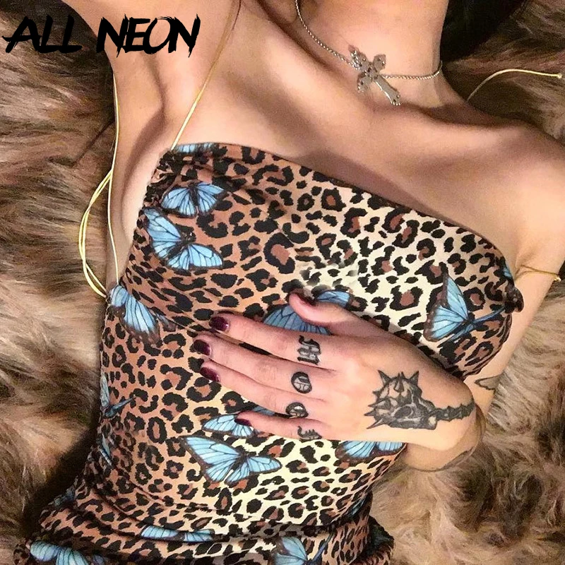 ALLNeon, винтажное леопардовое облегающее мини-платье с бретельками, Бандажное, с открытой спиной, с рюшами, вечернее платье для женщин, с принтом бабочки, сексуальная клубная одежда