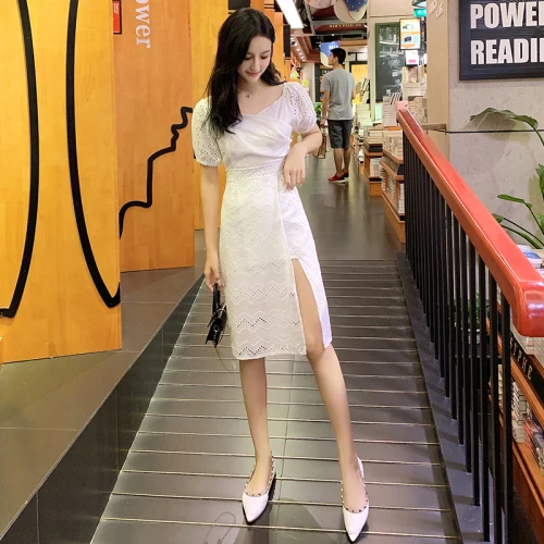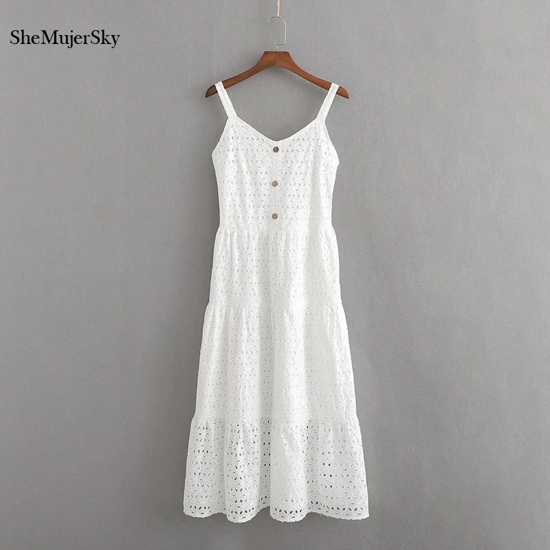 SheMujerSky/белое платье с вышивкой Лето 2019, открытая линия, бретелька сарафана, женские платья миди, корейская мода