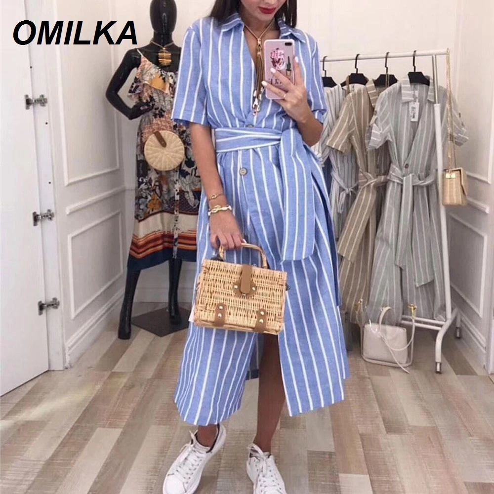 Женское платье в полоску OMILKA, винтажное длинное платье с коротким рукавом, v-образным вырезом и поясом на пуговицах, лето 2019