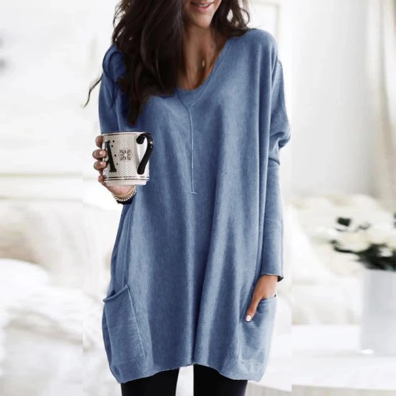 Однотонное платье миди с двойными карманами женское Повседневное платье с v-образным вырезом и длинными рукавами осеннее свободное платье ...