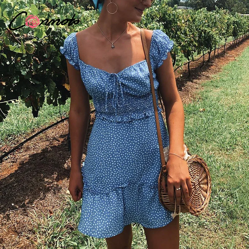Conmoto Винтаж горошек Высокая талия короткое платье для женщин Лето 2019 г. Новый Повседневное модные кружево пикантные с открытыми плечами