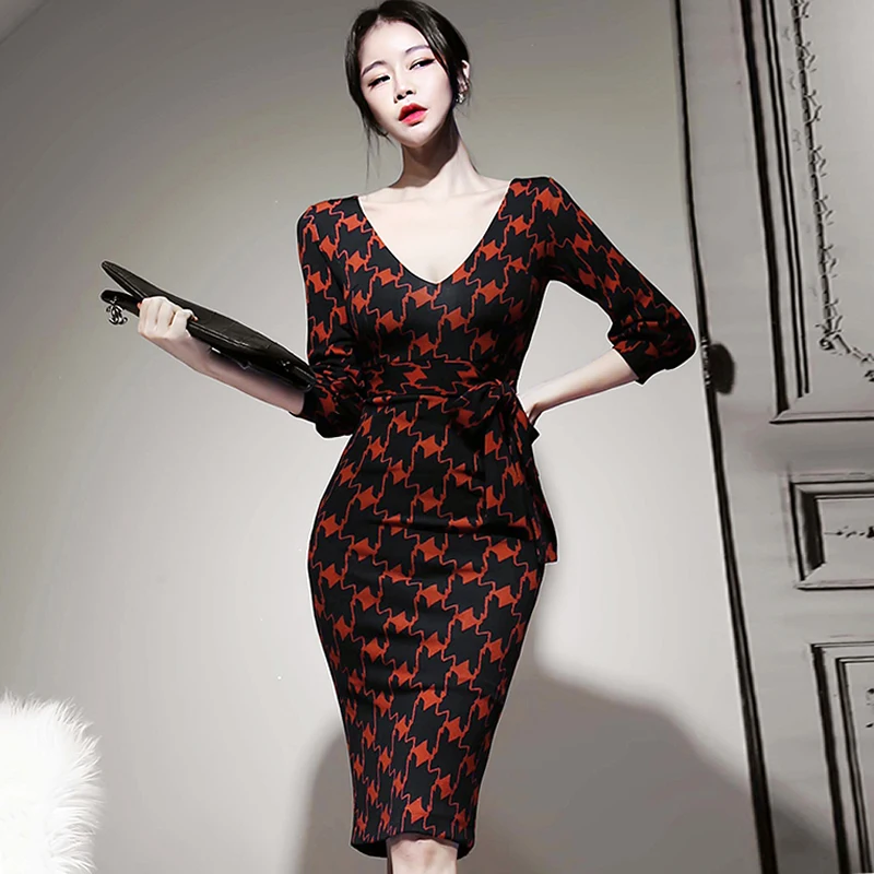 Зимнее корейское Сексуальное Женское Платье-карандаш с коротким рукавом и v-образным вырезом, с принтом звезды, с поясом, облегающее, длиной ...