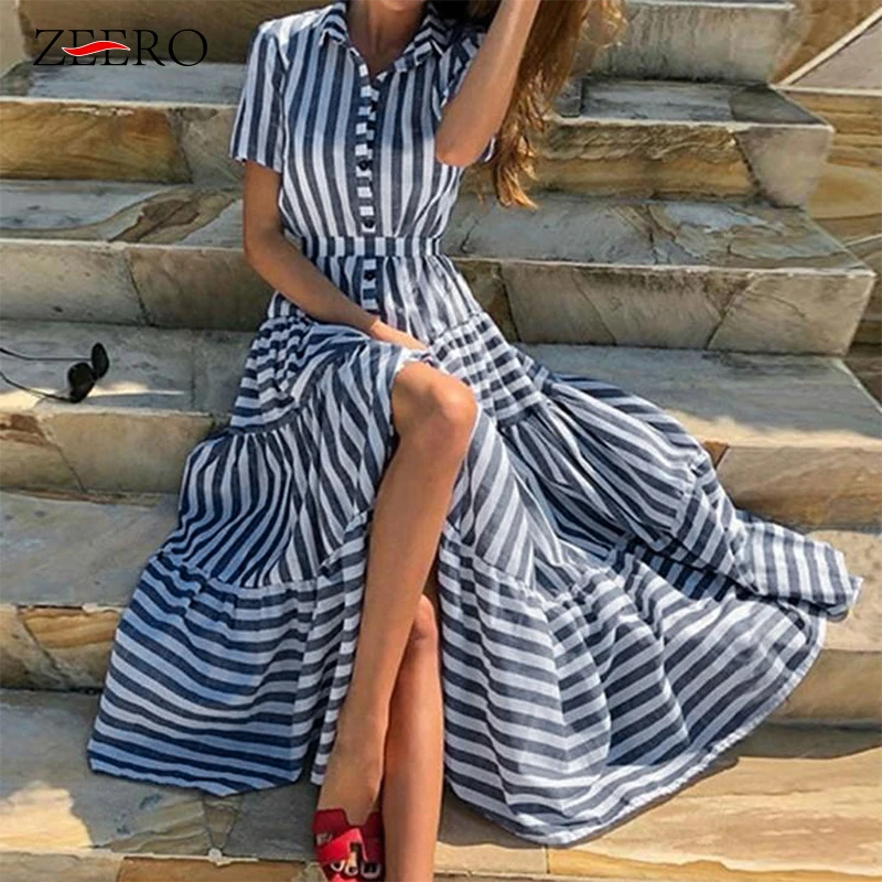 Корейское женское пляжное платье в полоску с коротким рукавом размера плюс, женское сексуальное однобортное винтажное повседневное длинное платье-рубашка, летние платья 2019
