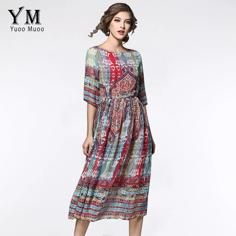 Yuoomuoo новый летний Повседневное богемный Для женщин шифоновое платье с половинными рукавами до середины икры свободные платья