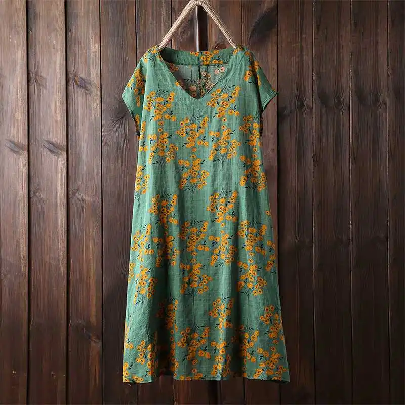 Женское винтажное платье с v-образным вырезом и коротким рукавом с цветочным принтом 2019 летнее хлопковое льняное платье, Повседневный Сараф...