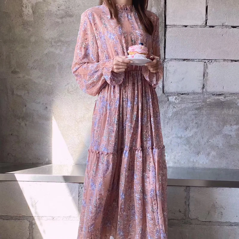 2020 летнее женское повседневное шифоновое платье с круглым вырезом и длинным рукавом с драпировкой и цветочным принтом коричневого цвета Vesdido