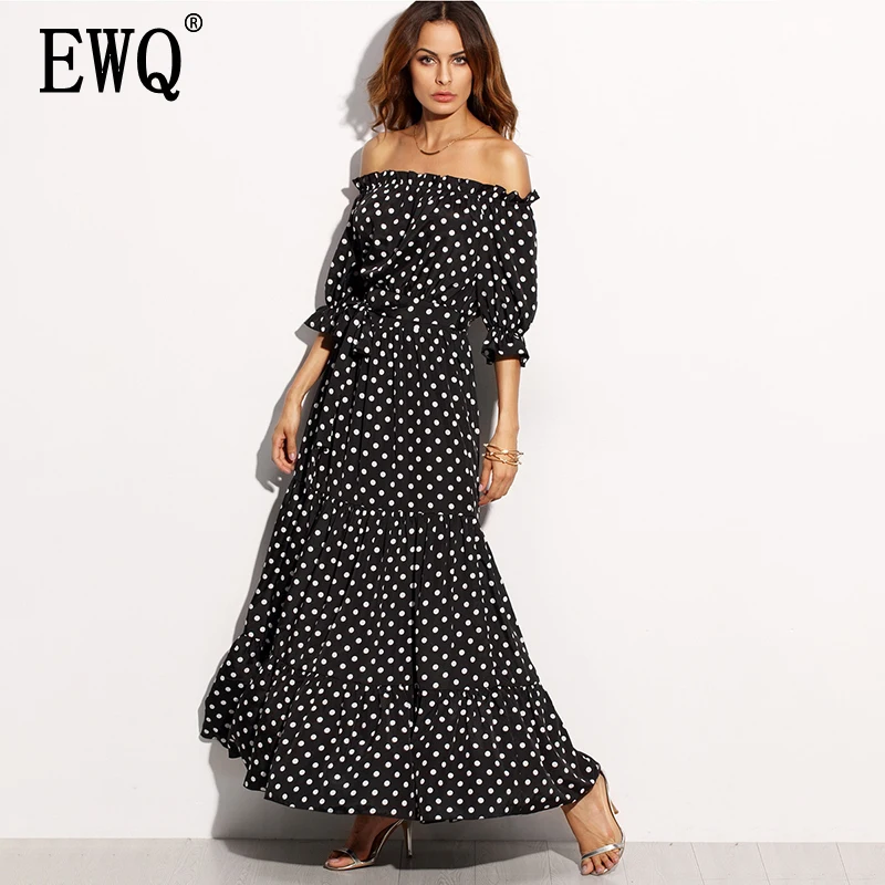 [EWQ] 2019 Весна Лето Slash шеи короткий рукав точка печати лоскутное империя талии Высокая уличная Женская Корейская одежда AD336