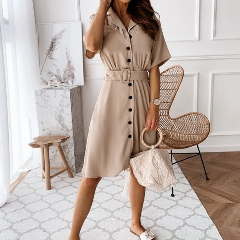 2020 летнее модное женское офисное платье трапециевидной формы с пуговицами и отложным воротником, Короткое мини-платье с коротким рукавом, однотонная элегантная одежда G1500