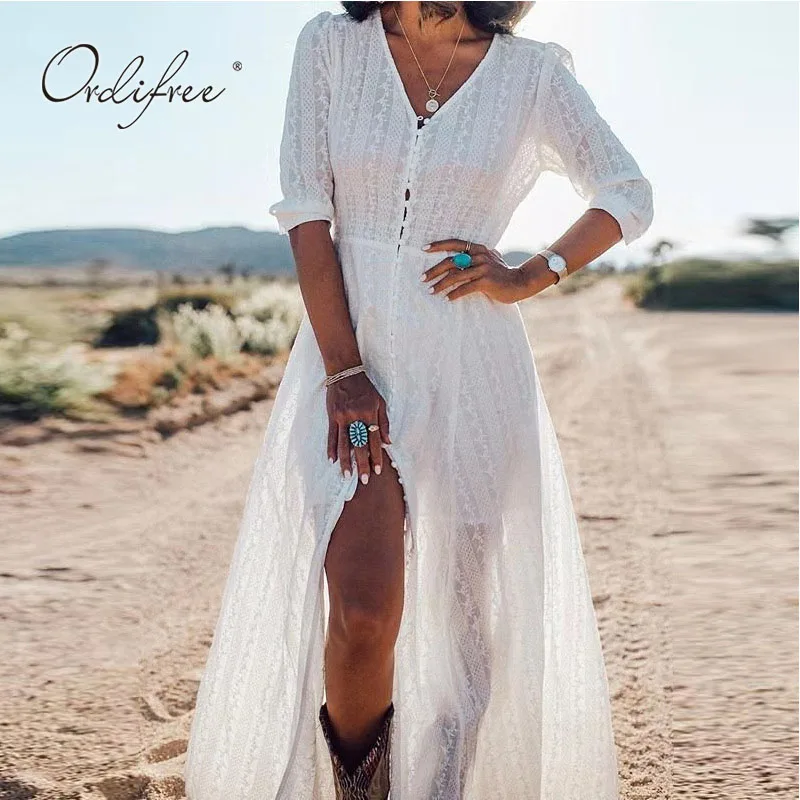Ordifree 2020, летний сарафан, бохо, женское макси платье, короткий рукав, белое кружево, длинная туника, Пляжное Платье