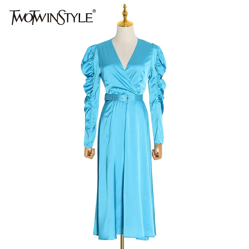 TWOTWINSTYLE сексуальное Вечерние женское платье с v-образным вырезом, пышным длинным рукавом, высокой талией и поясом, длинные платья с рюшами, женская модная одежда