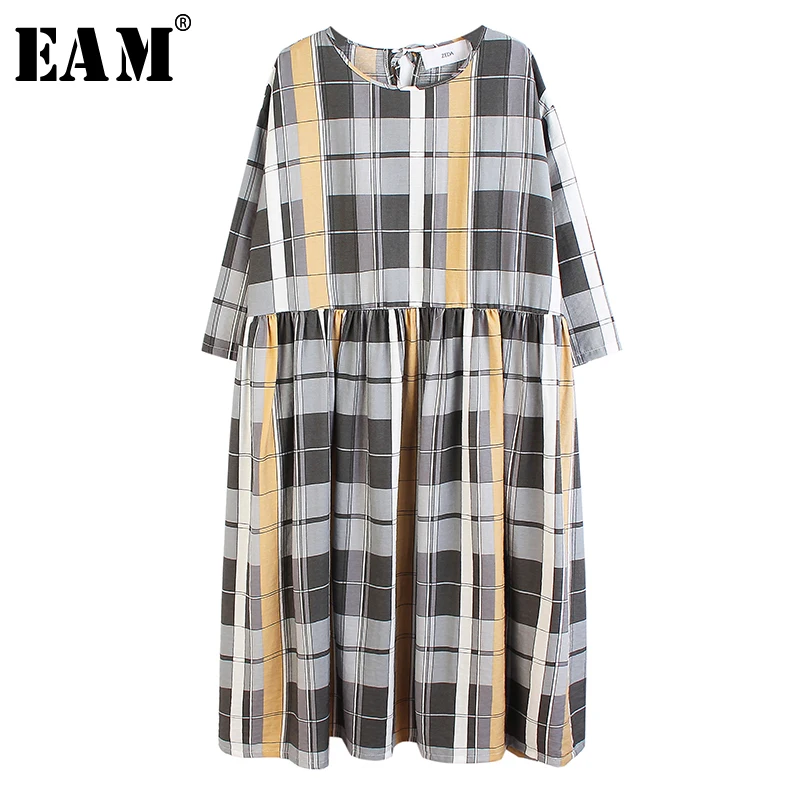Женское платье EAM, серое клетчатое платье большого размера с круглым вырезом и рукавом три четверти, весенне-летняя мода 2020 1T549