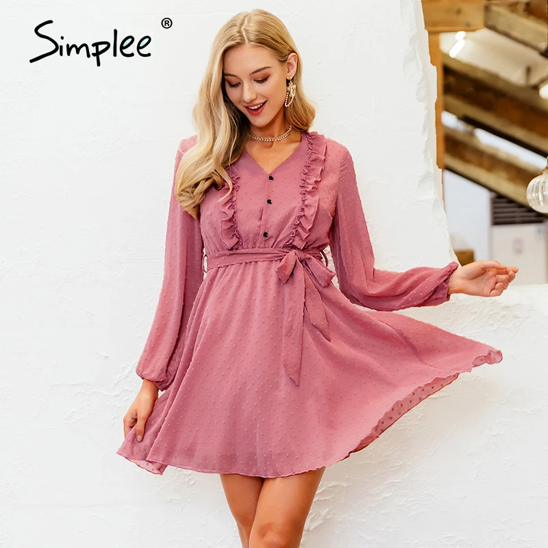 Simplee Элегантное открытое женское платье с длинным рукавом и рюшами, пуговицы, v-образный вырез, летнее платье, ремень для фонарика, облегающее платье для вечеринки vestidos