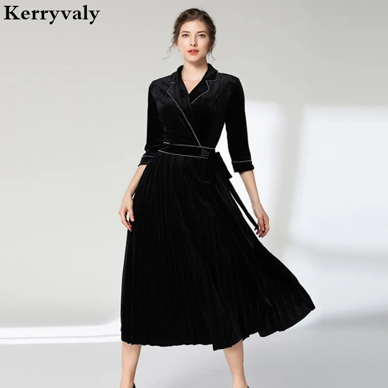 OL Зима Женское бархатное черное офисное платье Robe Femme Hiver 2019 миди рубашка Готический блеск подвечерние иум праздничное платье Sukienki K5783