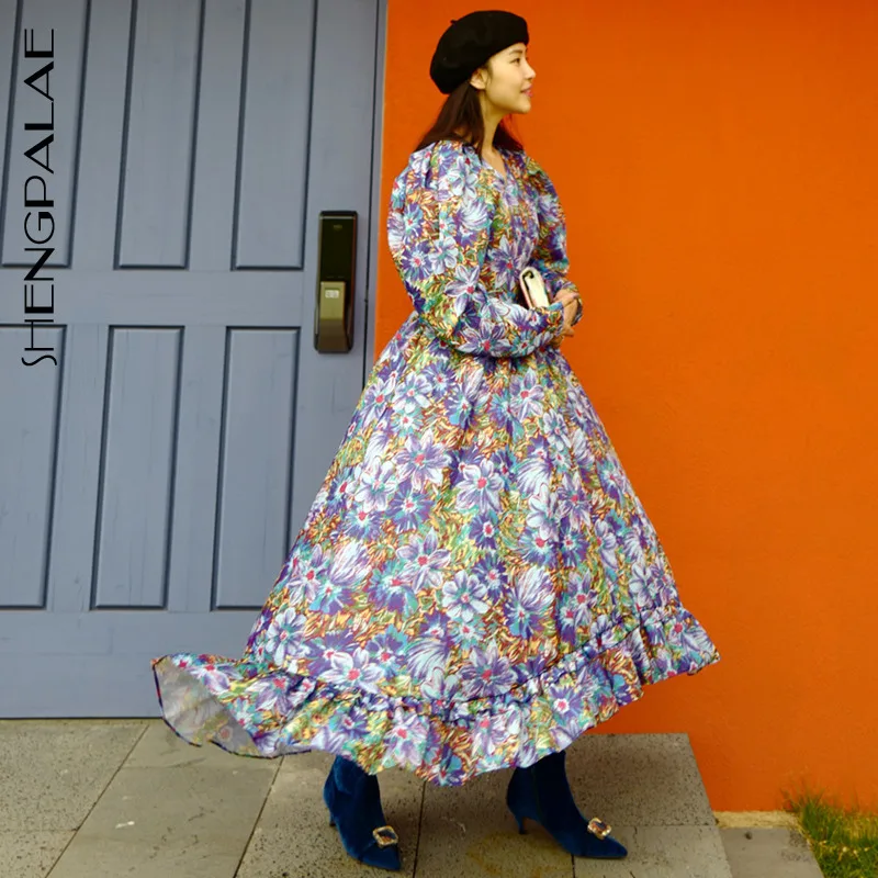 SHENGPALAE 2020 новое летнее женское винтажное Свободное платье с высокой талией с цветочным принтом и v-образным вырезом тонкое элегантное платье с пышными рукавами ZA3342