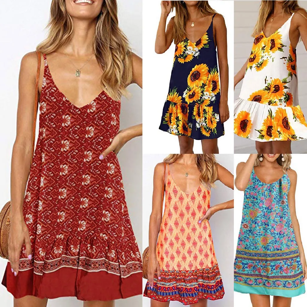 Повседневное платье женская одежда 2019 Сексуальная женская летняя с цветочным принтом V шеи гофрированная линия качели пляжное короткое пла...