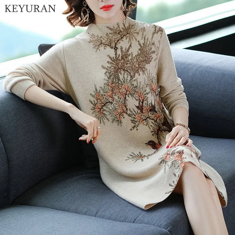 Винтажное осеннее приталенное платье-свитер миди для женщин с высоким воротом и длинным рукавом, вязаные платья с принтом деревьев и птиц, ж...