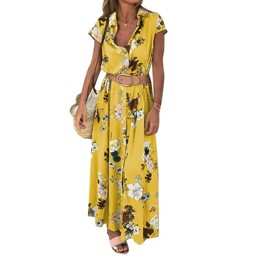 Богемный платье в этническом стиле цветочный принт в стиле бохо V образным вырезом отложной воротник короткий рукав для женщин Макси платье с поясом