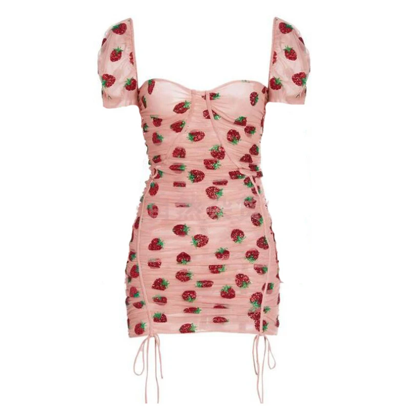 Женское платье с принтом клубники GALCAUR, мини-платье большого размера с пышными рукавами, высокой талией и бантом на шнуровке, 2020