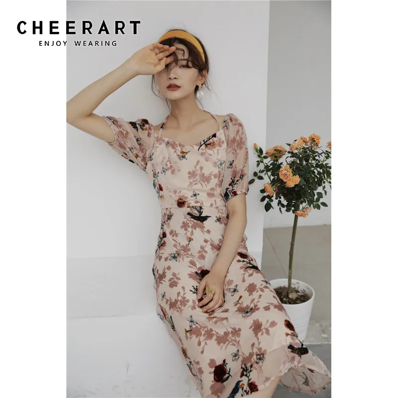 Женское длинное платье миди CHEERART, розовое платье с цветочным принтом и квадратным вырезом, с пышными рукавами, 2019