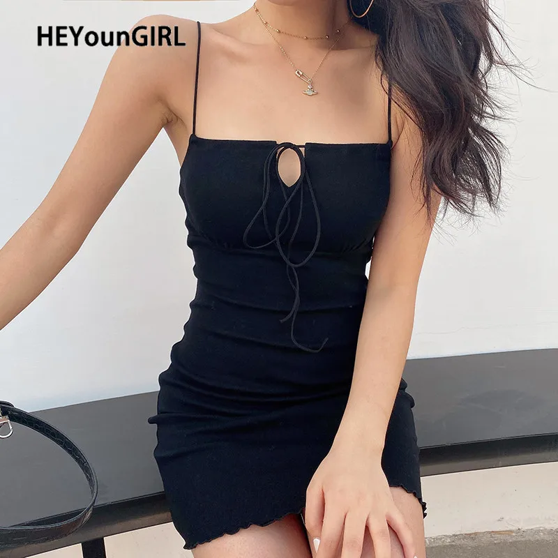 HEYounGIRL, Черное мини-платье без рукавов на тонких бретелях, сексуальное облегающее платье с открытой спиной, женские летние короткие платья с рюшами, для девушек 2020