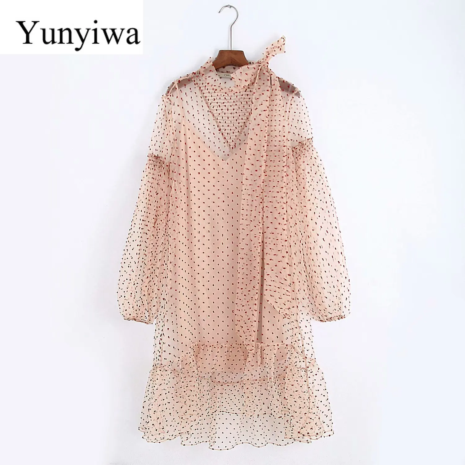 2019 женское Новое шелковое Сетчатое платье в горошек с длинным рукавом повседневное женское сексуальное платье макси с длинным рукавом элег...