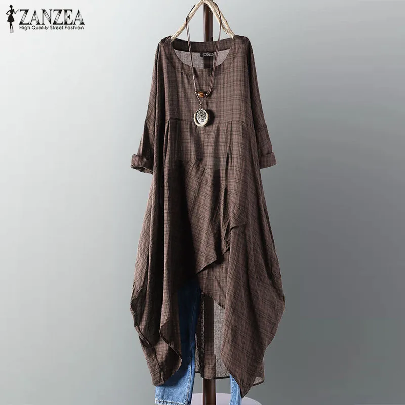 Женское асимметричное платье кафтан 2019 ZANZEA женское с длинным рукавом vestidos Check платье клетчатый сарафан повседневное белье роковой 5XL