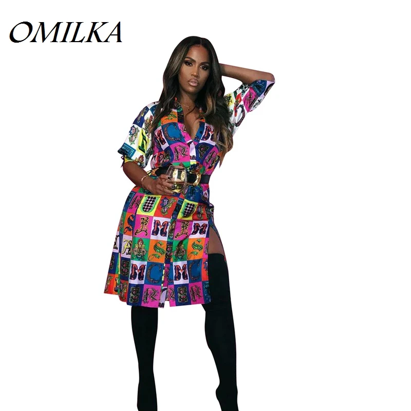 OMILKA 2018 осеннее женское платье с рукавом три четверти и отложным воротником с рисунком повседневное свободное платье в стиле хип-хоп