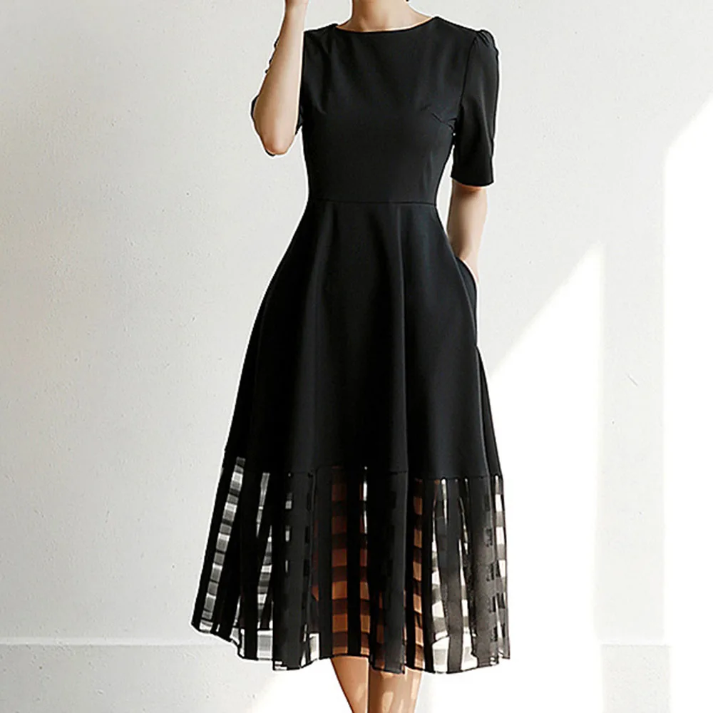 Однотонное Черное женское корейское японское ТРАПЕЦИЕВИДНОЕ винтажное платье для офиса с коротким рукавом и высокой талией, летнее платье до середины икры, Vestidos