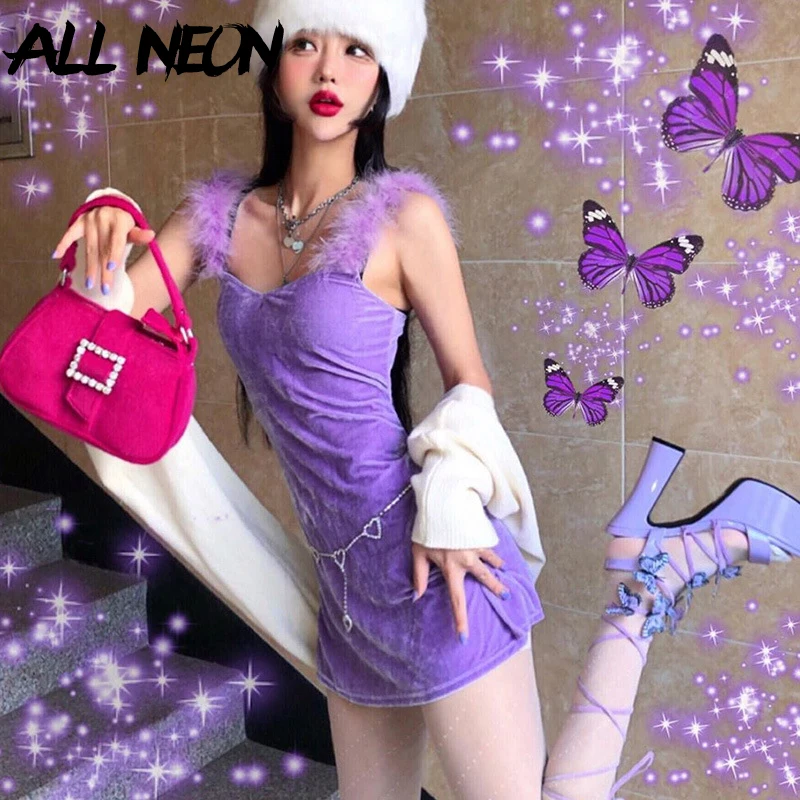 ALLNeon вельветовые платья облегающие мини-платья с открытой спиной и перьями наряды для девочек милые повседневные платья винтажная Весна 2020