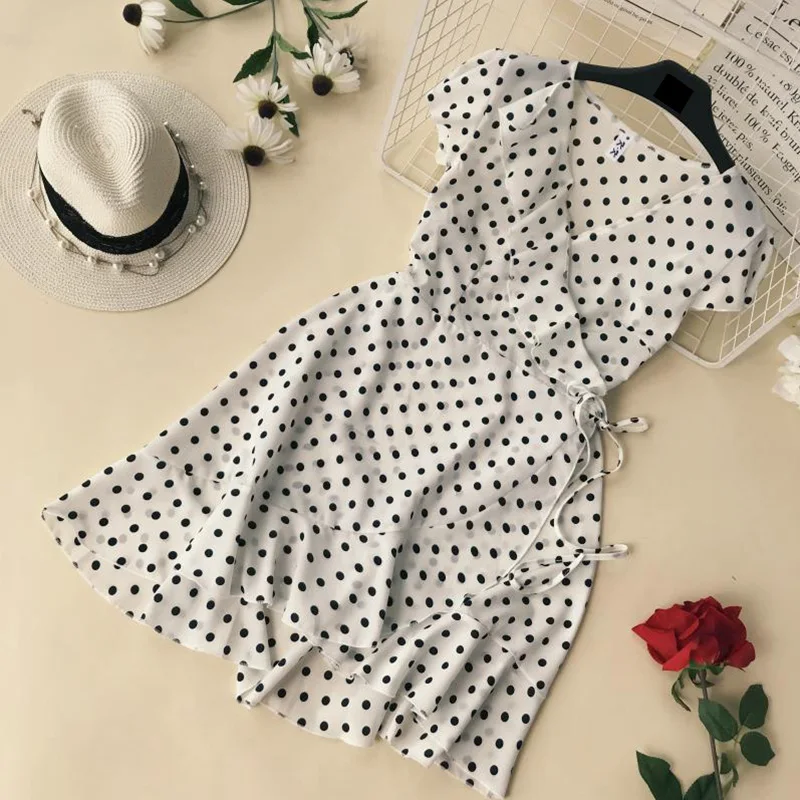 FTLZZ женские мини-платья в горошек Новинка 2019 года, летнее платье с v-образным вырезом, асимметричное, гофрированное, на шнуровке, с оборками, к...