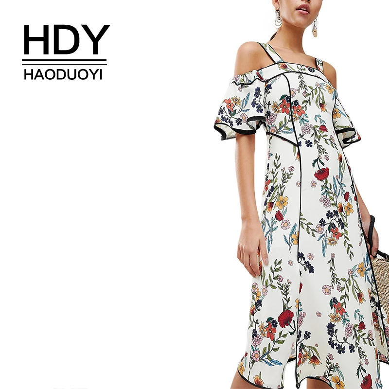HDY Haoduoyi для женщин богемный цветочный принт с открытыми плечами миди ремень Slash средства ухода за кожей шеи рюшами короткий рукав сбоку