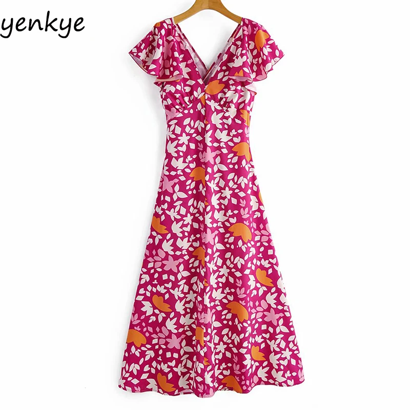 Летнее платье 2020, женское пляжное платье с v-образным вырезом и коротким рукавом с цветочным принтом, женское повседневное длинное платье трапециевидной формы с высокой талией SYJZ456