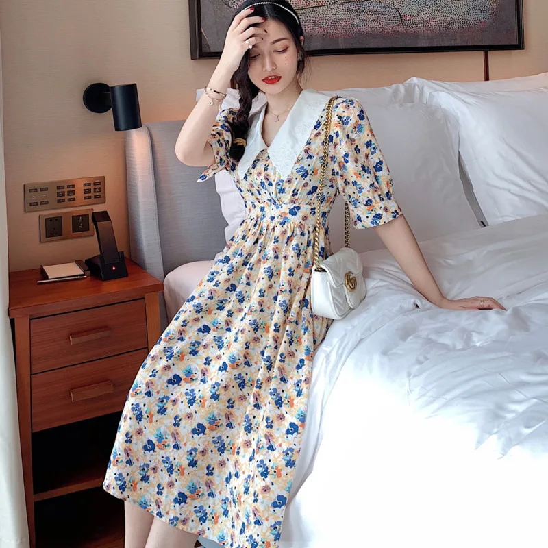 Летнее модное женское винтажное длинное платье, женское элегантное тонкое платье с цветочным принтом, воротник Питер Пэн, короткий рукав, шикарное пляжное платье в стиле бохо